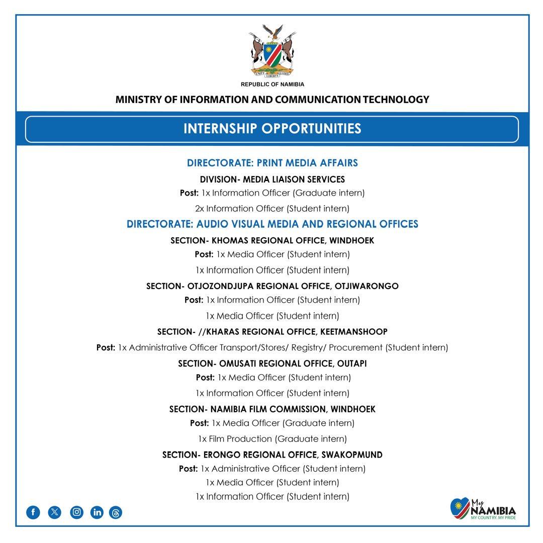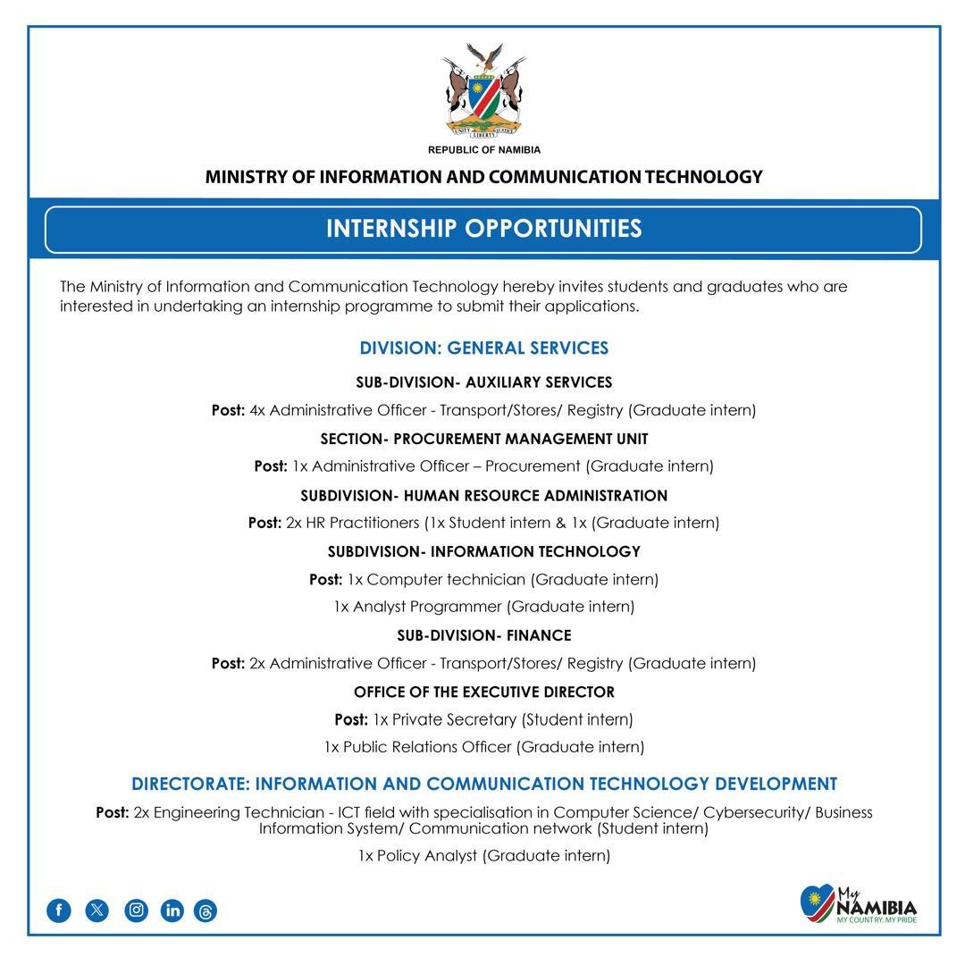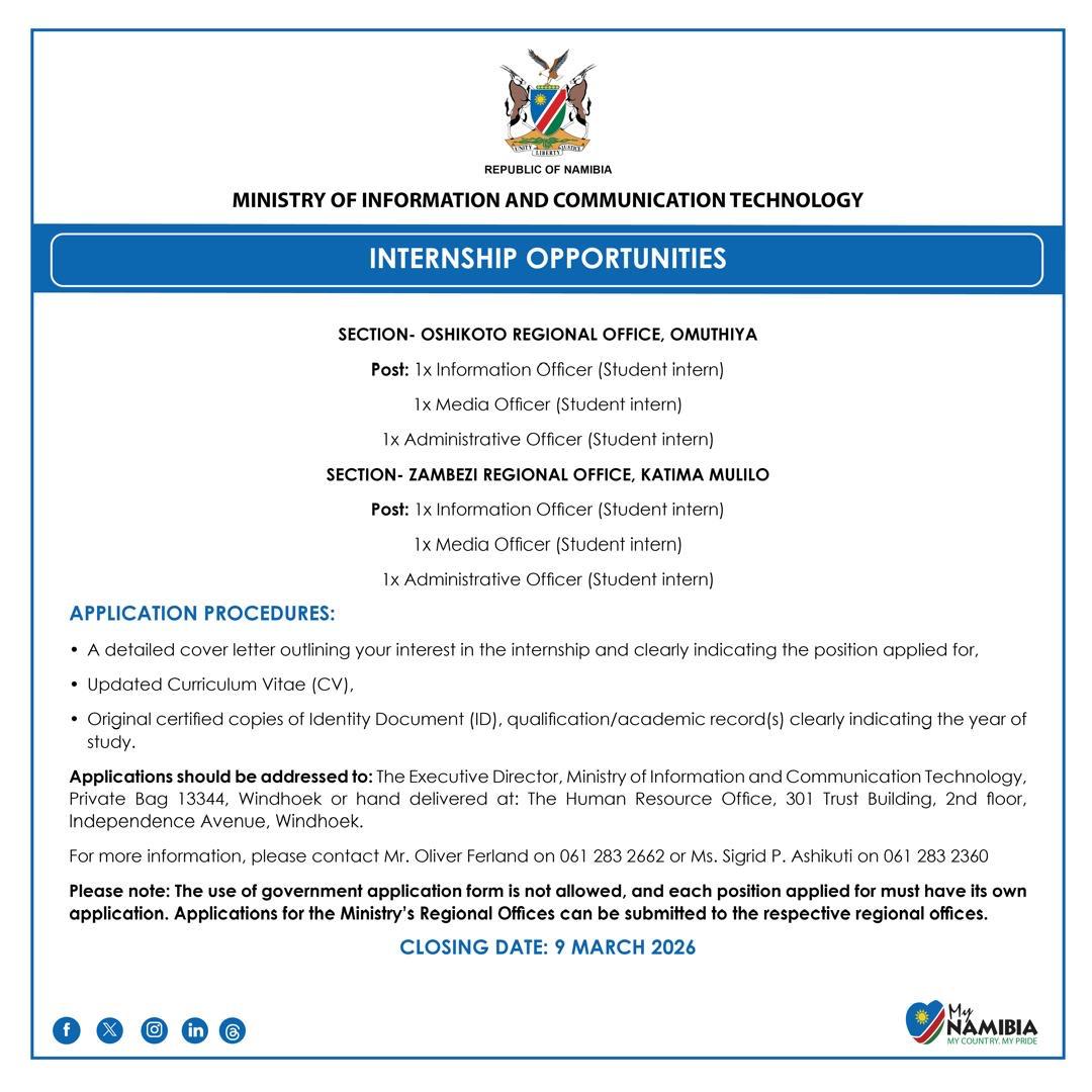 Applications should be addressed to:The Executive Director, Ministry of Information and Communication Technology, Private Bag 13344, Windhoek or hand delivered at: The Human Resource Office, 301 Trust Building, 2nd floor, Independence Avenue, Windhoek.
